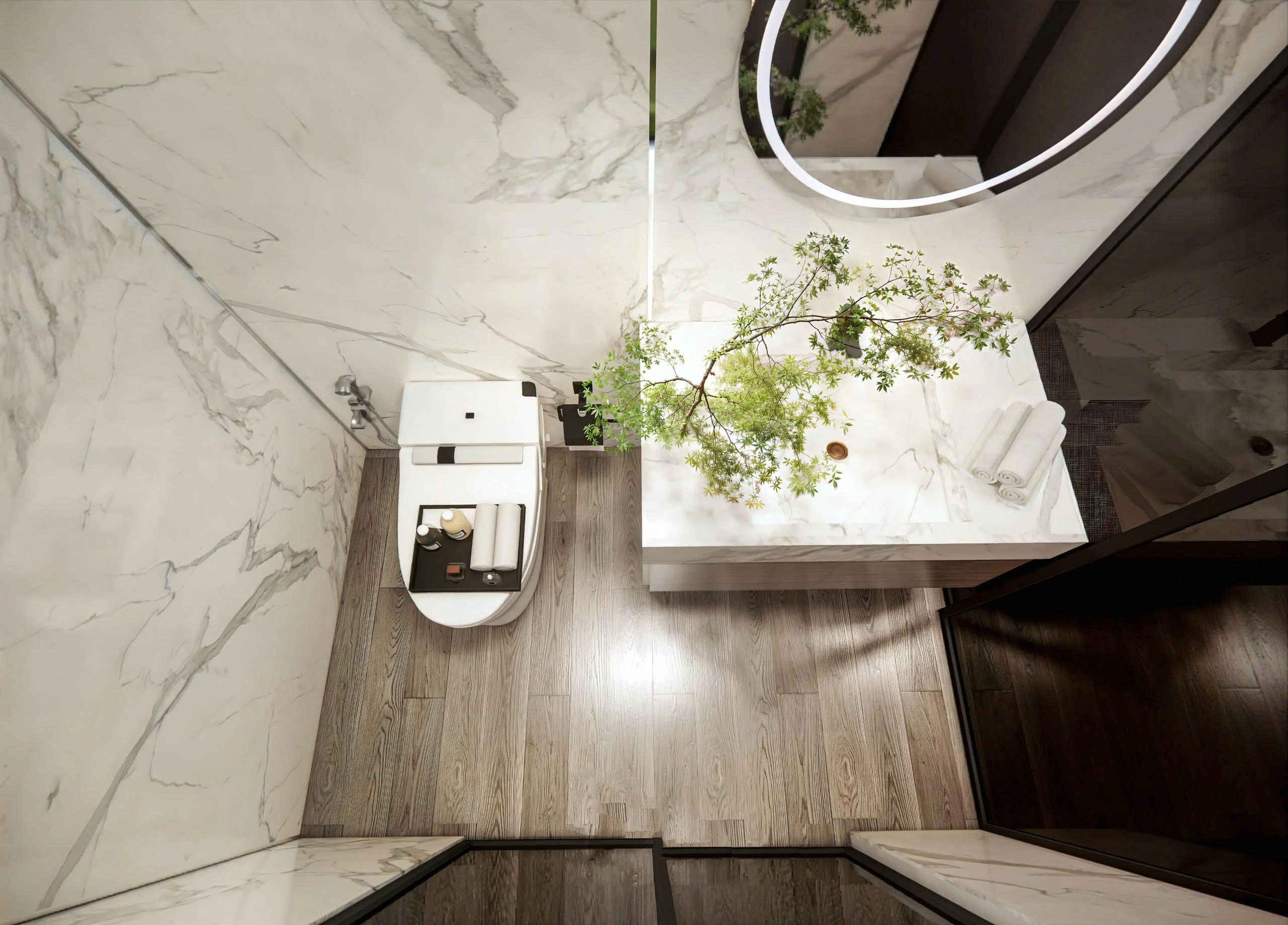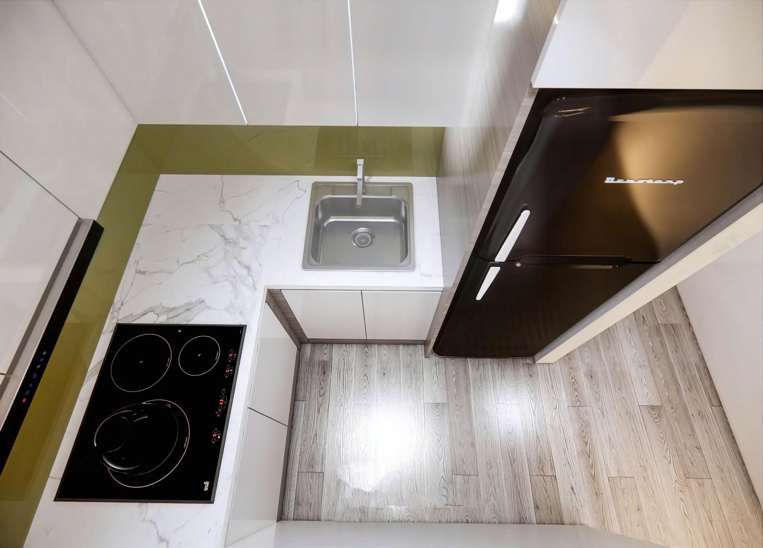 Không gian bếp và nhà vệ sinh được thiết kế tối giản, tiện nghi phục vụ đầy đủ nhu cầu thiết yếu của khách hàng